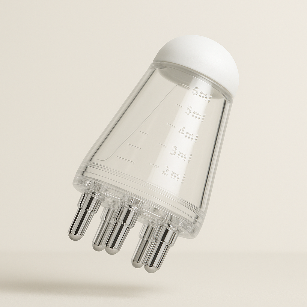 Der Essenzkamm ist ein speziell entwickelter Applikator, der das Öl direkt an den Haarwurzeln verteilt – ohne Überschuss, ohne die Längen zu fetten – und gleichzeitig die Mikrozirkulation dank seiner glatten Massageaufsätze aus Edelstahl stimuliert.
